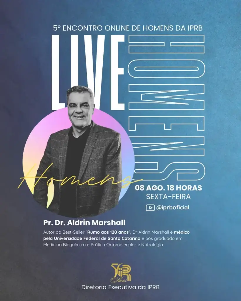A Diretoria Executiva da IPRB; na pessoa de seu presidente, Pr. Advanir Ferreira, tem a alegria de convidar a todos para o 5º Encontro Online de Homens da IPRB, que será realizado na próxima sexta-feira, 8 de agosto (sexta-feira), às 18 horas, em transmissão ao vivo pelo canal oficial da igreja no YouTube (@iprboficial).